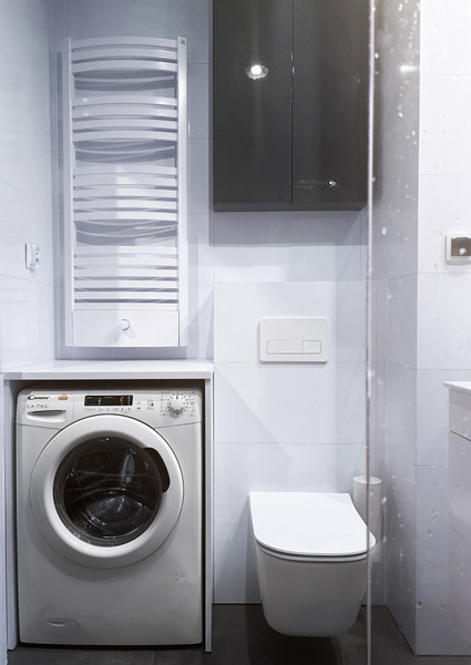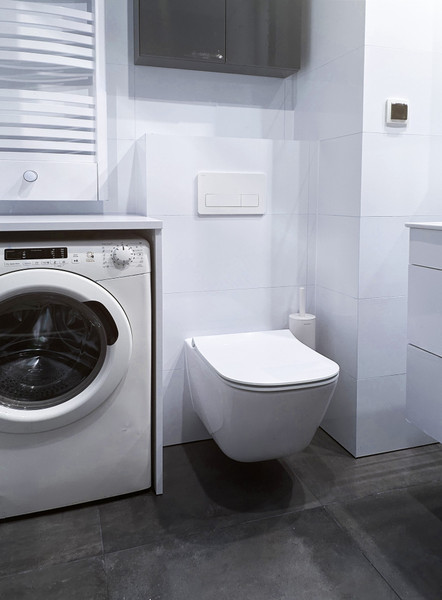 • w łazience pralka i prysznic z odpływem liniowym