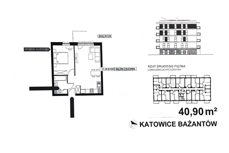 • pokój dzienny z aneksem kuchennym o pow. 21,38 m2 i balkonem