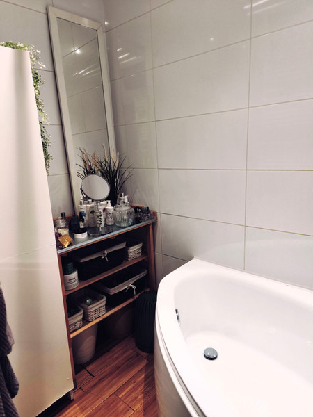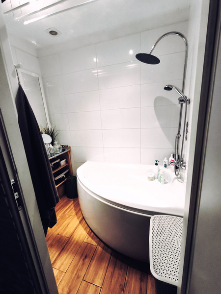 5) Łazienka - wanna z funkcją prysznica, słupek łazienkowy, regał na kosmetyki.