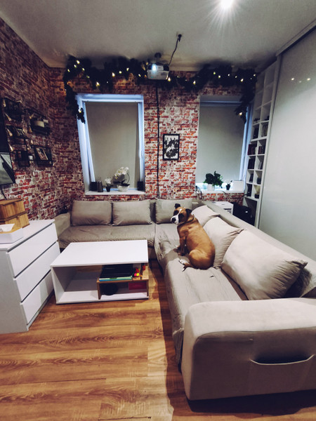 2) Pokój dzienny - duża szafa przesuwna na całą ścianę o wymiarach około 5m długości na 3m, narożnik, komoda, stolik kawowy, stół jadalny z krzesłami, szafka RTV.