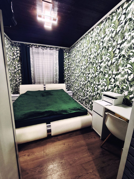 3) Sypialnia - duże łóżko o wymiarach 220 x 240, biurko, szafa narożna.