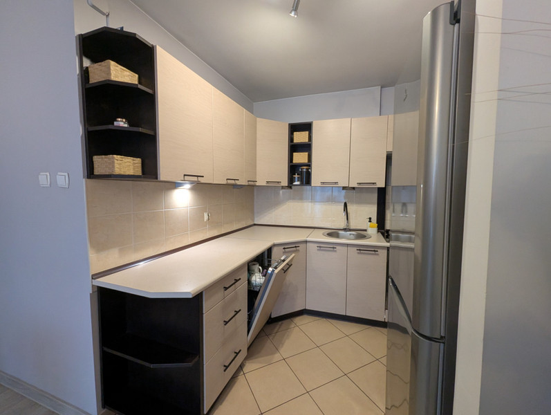 - wyposażony aneks kuchenny (płyta gazowa, piekarnik, zmywarka, lodówka) otwarty na salon z szerokimi blatami roboczymi