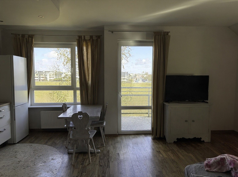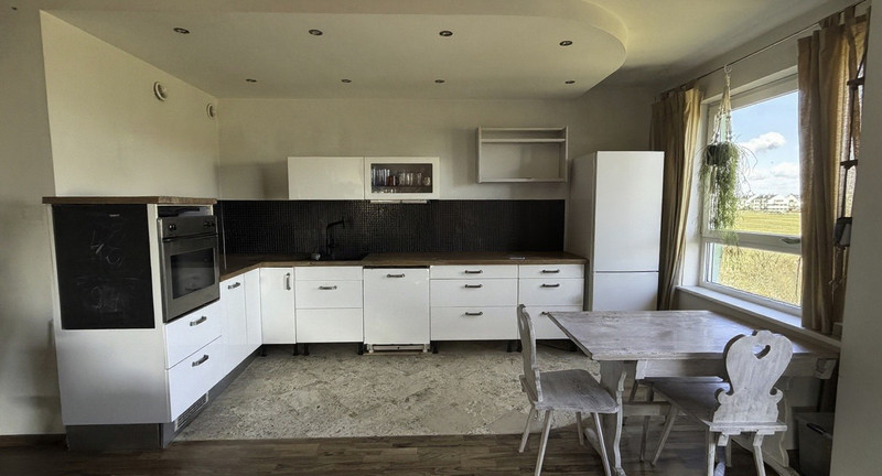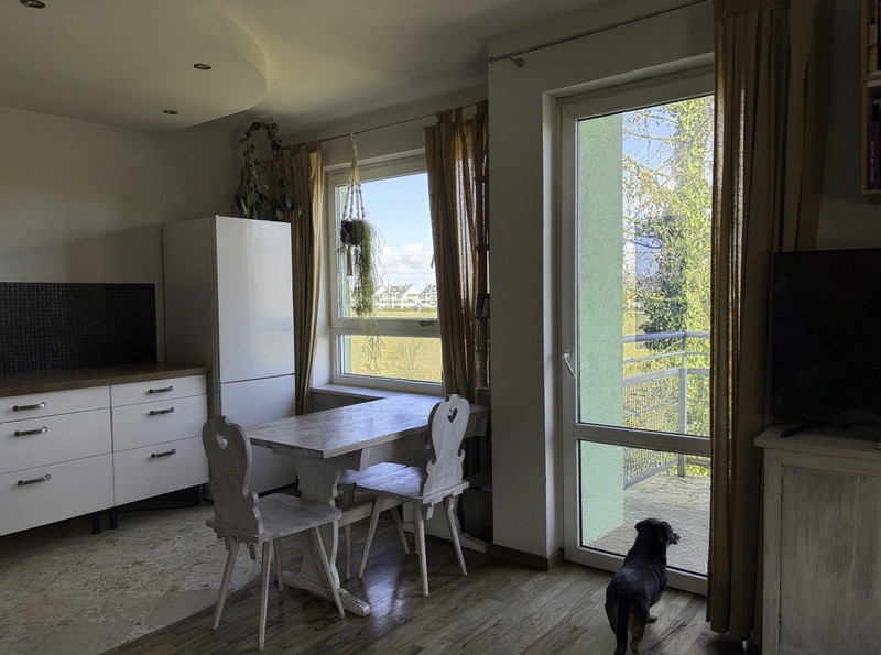 - kuchnia z otwartym salonem - pow. 26,5 m. kw., na podłodze w części kuchennej położono trawertyn, a w części dziennej i korytarzu parkiet z palisandru. Z salonu wyjście na balkon, który wychodzi na niezagospodarowaną łąkę i pole, dzięki czemu daje poczucie pełnej prywatności. W tym roku (2026) zostanie wykonany remont balkonu - nowa warstwa hydroizolacyjna, barierki, oraz z wymiana płytek (usługa zakontraktowana przez wspólnotę w 2025 roku dla całego osiedla).