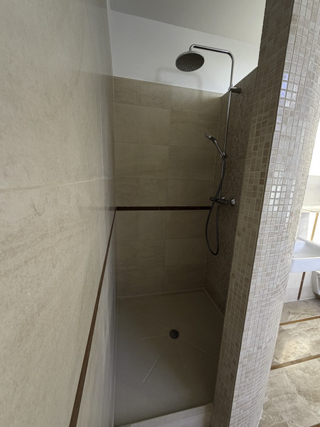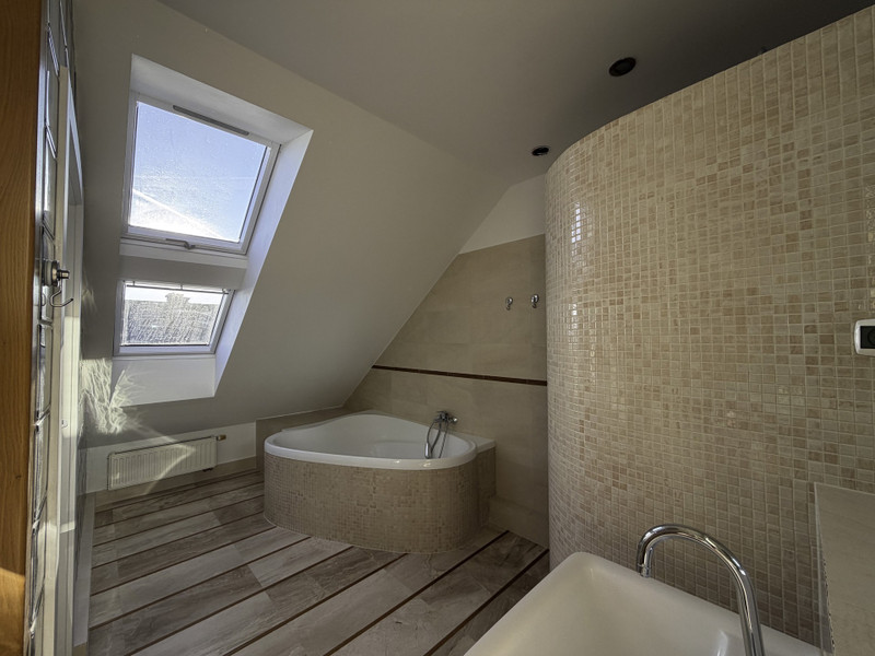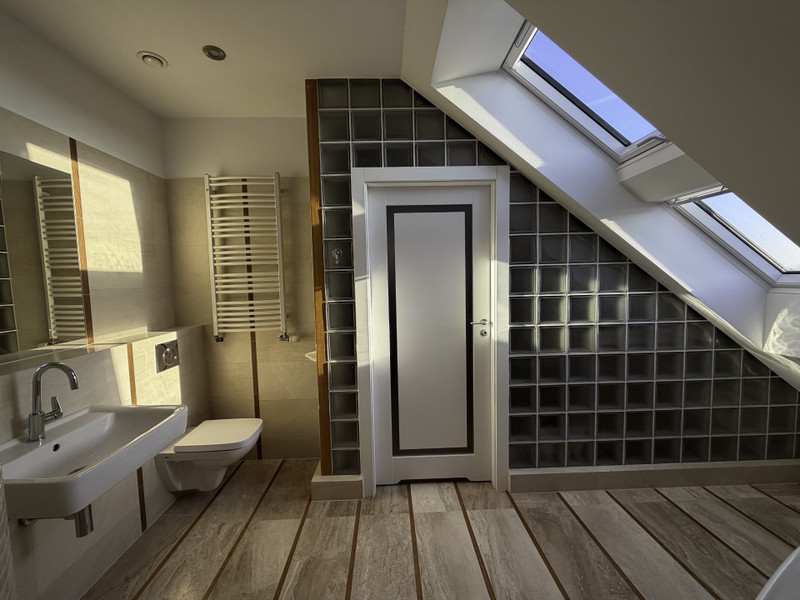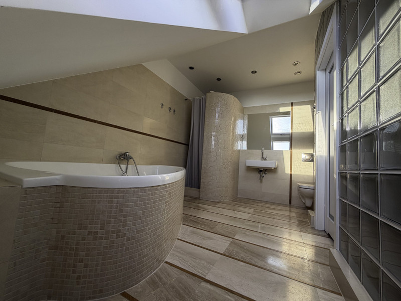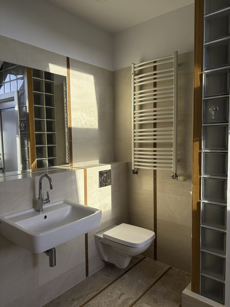 - przestronna łazienka z oknami, o powierzchni 11,7 m kw. W łazience znajduje się duża wanna oraz prysznic typu walk in. Na podłodze położono płytki marmurowe Breccia Sarda z elementami bukowych listew i korka.