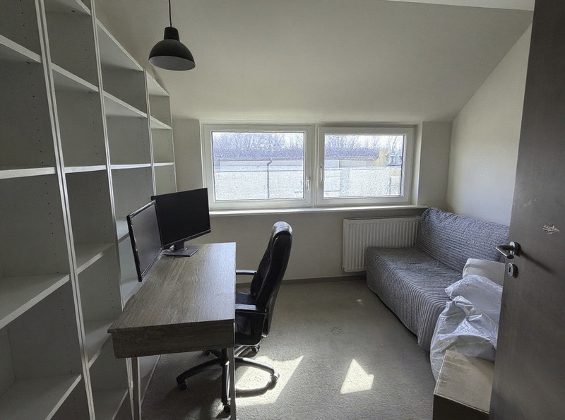 - gabinet/pokój dziecięcy - pow. 9,5 m. kw., aktualnie pełni funkcję gabinetu i pokoju gościnnego z zabudowa ściany z półek, do dowolnej aranżacji
