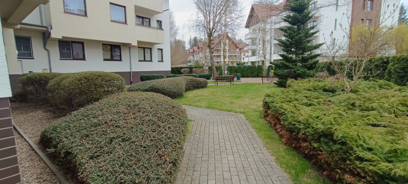 Wokół budynku pięknie zaprojektowany ogród z miejscami do wypoczynku i ćwiczeń.