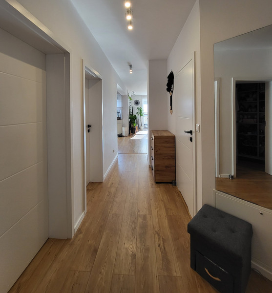 Mieszkanie o powierzchni 71 m mieści się na parterze w 4 piętrowym bloku zbudowanym w 2010r. Składa się z 3 pokoi (dwa pokoje + salon z kuchnią), łazienki, pralni oraz garderoby. W salonie znajdują się wyjścia na dwa balkony. Mieszkanie przeszło generalny remont około 3/4 lata temu.