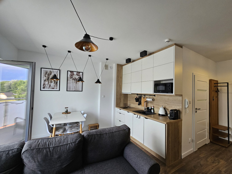 Apartament składa się z przestronnego salonu z aneksem kuchennym z wyjściem na taras, słonecznej sypialni oraz łazienki z WC.