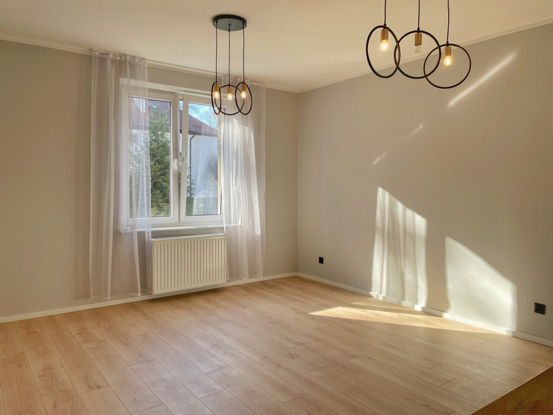 • Kuchnia: Nowa zabudowa kuchenna z blatem w kolorze drewna, wyposażona w nowy piekarnik i płytę grzewczą.
