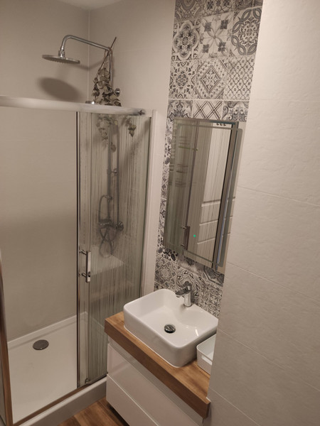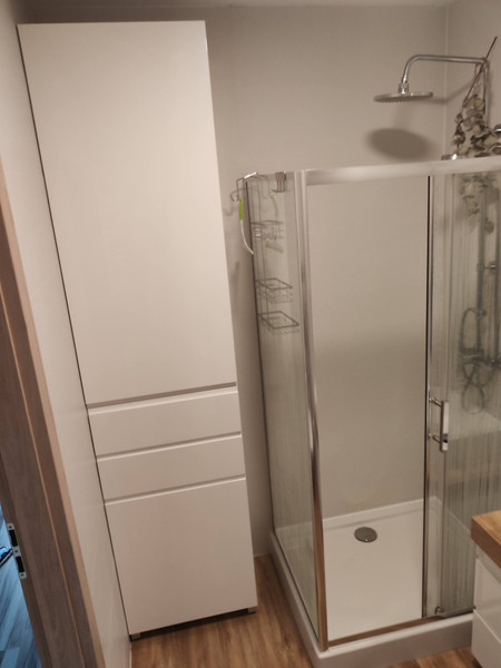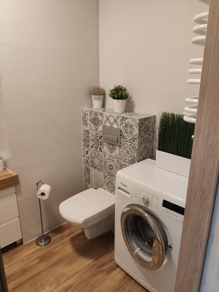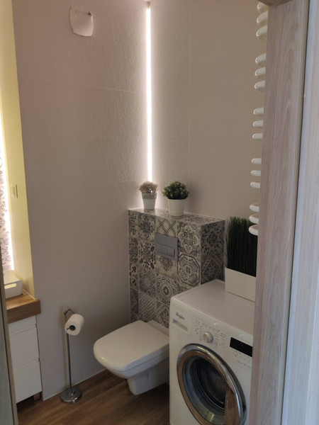• łazienka: nowoczesne wykończenie, WC Cersanit, pralka Whirlpool, zabudowa na wymiar (lakierowane fronty)
