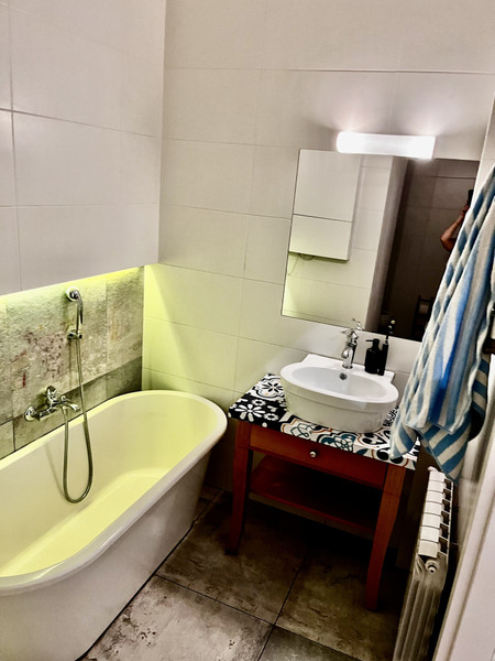 Balkon oraz dostęp do ogrodu z miejscem na grill, idealne do odpoczynku w ciepłe dni. Wysokie sufity zapewniają poczucie przestrzeni.