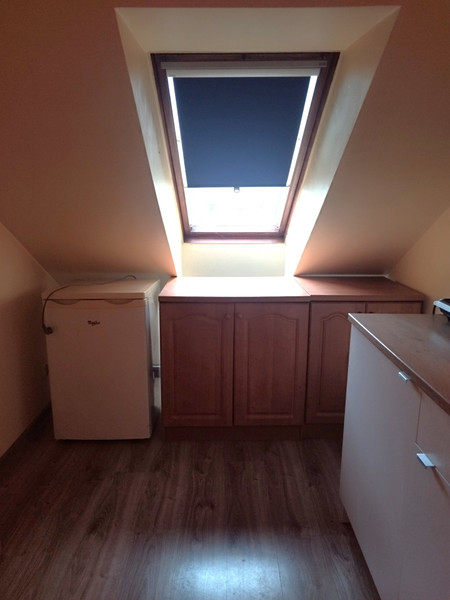 Okna dachowe drewniane. W kuchni, łazience i przedpokoju płytki, w pokojach panele.
