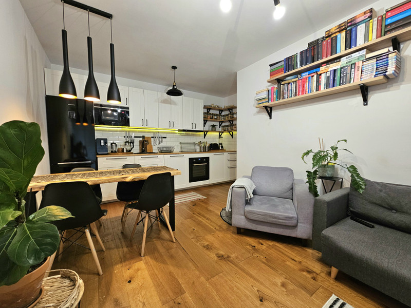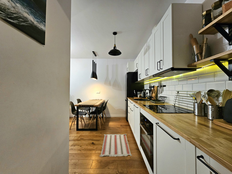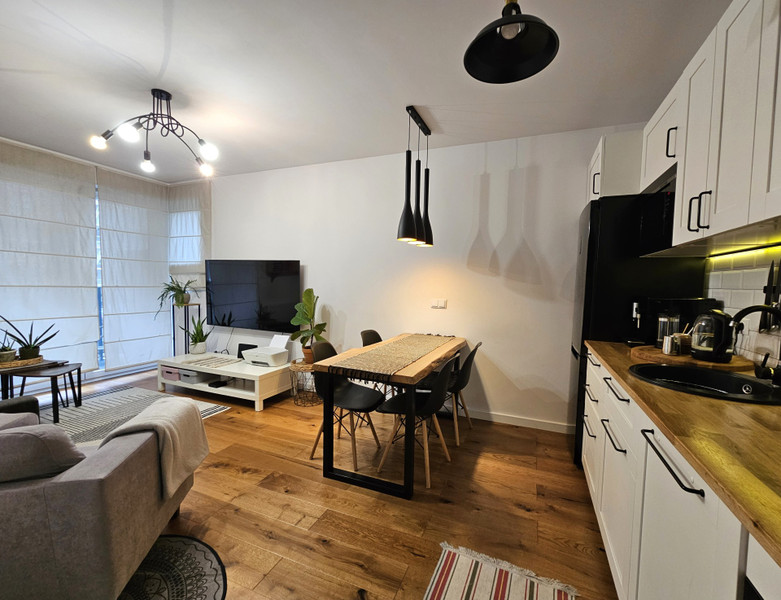 • Salon z aneksem kuchennym — zmywarka 60, płyta indukcyjna, piekarnik.