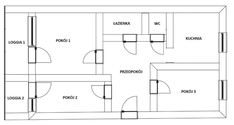 Mieszkanie składa się z przedpokoju, małego pokoju, średniego pokoju, dużego pokoju, łazienki z wanną i umywalką, WC i jasnej kuchni. Z średniego i dużego pokoju są wyjście do oddzielnych loggi.
