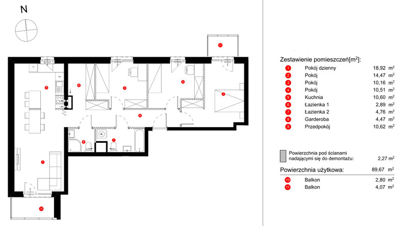 Salon: 18,92 m² z wyjściem na balkon