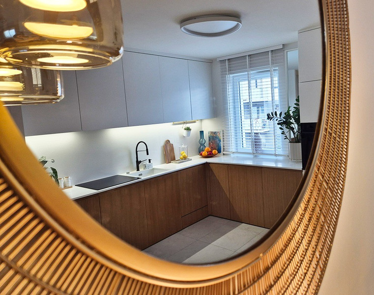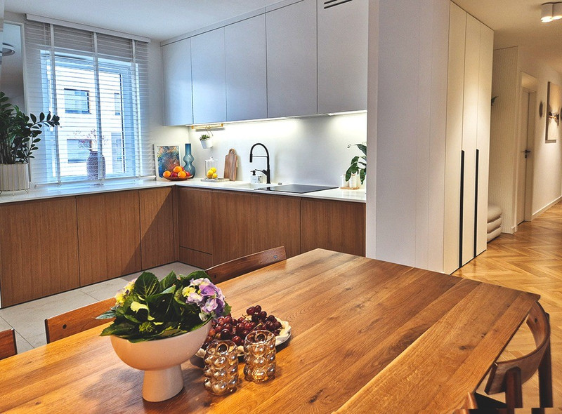 Zabudowa kuchenna wykonana na wymiar (lakier + fornir dębowy)