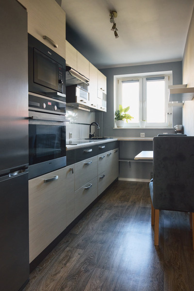 - Nowoczesne umeblowanie, w tym stałe zabudowy oraz AGD, w cenie mieszkania (bez pralki)
