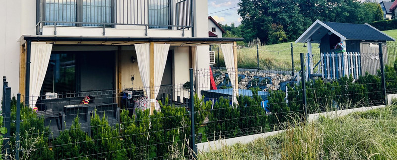 Mieszkanie klasy premium. Luksusowy, jasny, w pełni wyposażony i klimatyzowany apartament jednorodzinny; 50 m² z prywatnym ogrodem i zadaszoną pergolą oraz przepięknym widokiem na okolice. Do mieszkania przynależą dwa miejsca parkingowe. Osiedle zamknięte i monitorowane – Limanowa, 900 m do centrum!
