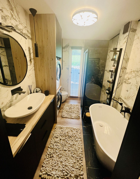 • Luksusowa i przestronna łazienka z nowoczesną kabiną prysznicową, wanną wolnostojącą oraz pralką i suszarką.