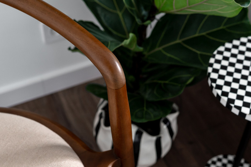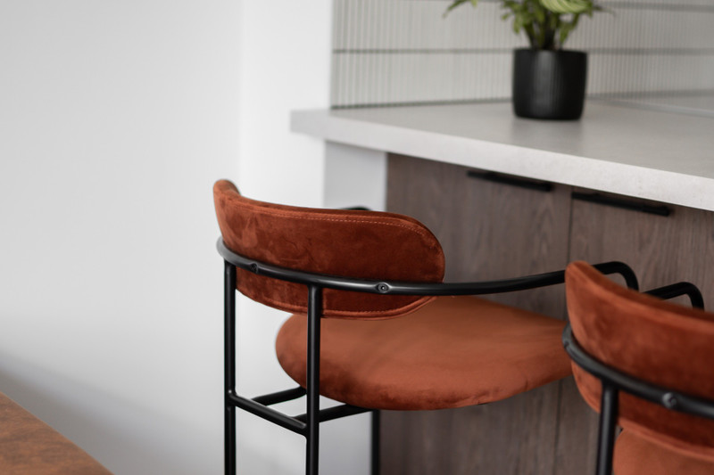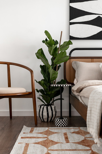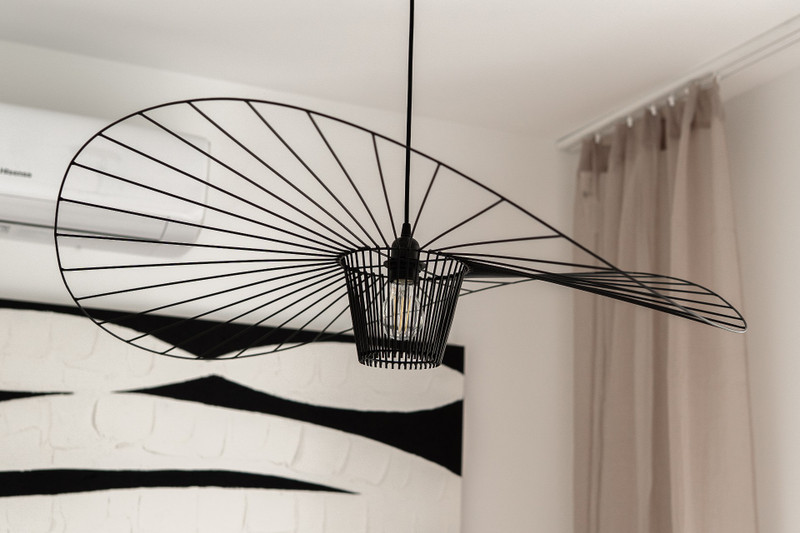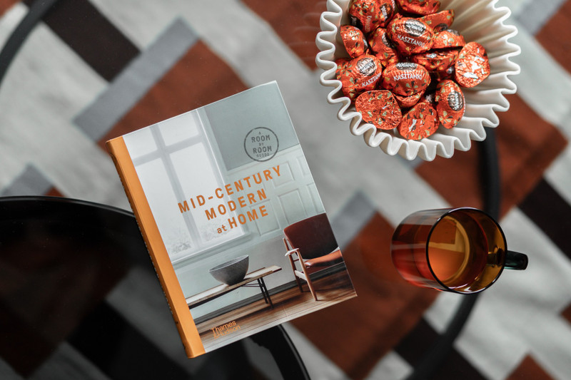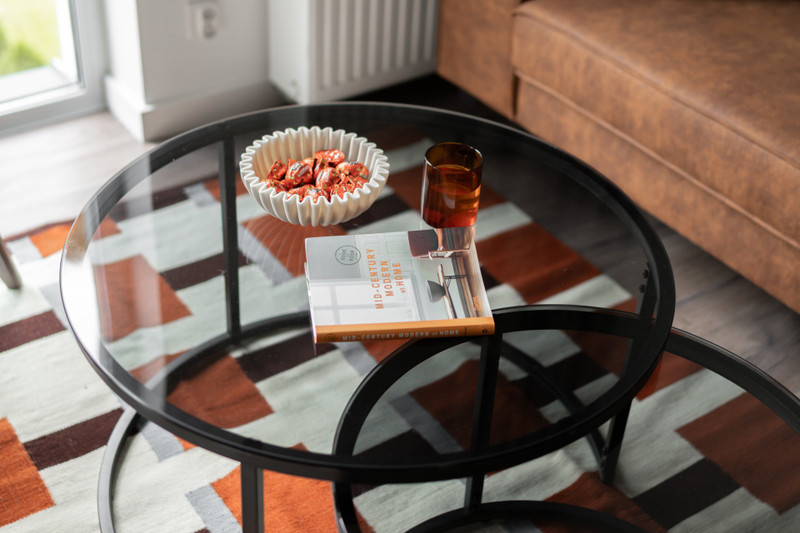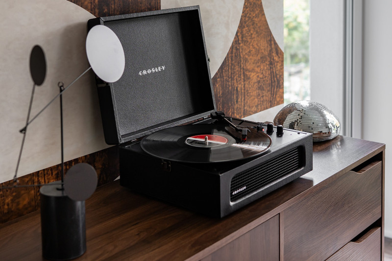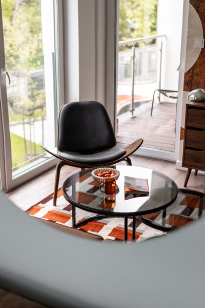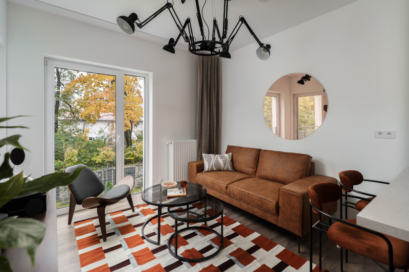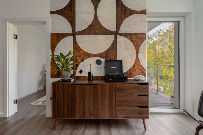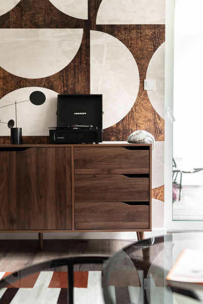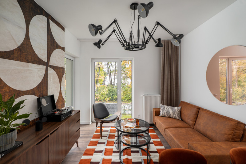 Geometryczne stoliki, oprawione grafiki, gramofon Crosley, który gra cicho w tle, i dekoracyjne oświetlenie, które nadaje wnętrzu rytmu.