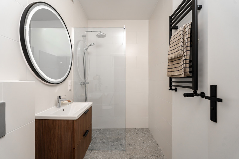 Klimatyzacja sterowana z telefonu oraz ogrzewanie podłogowe w łazience z inteligentnym panelem sterowania podnoszą komfort codziennego życia i sprawiają, że wnętrze jest tak funkcjonalne, jak wygląda.
