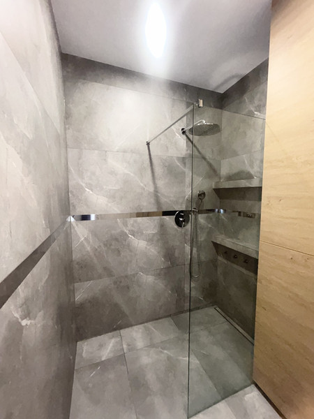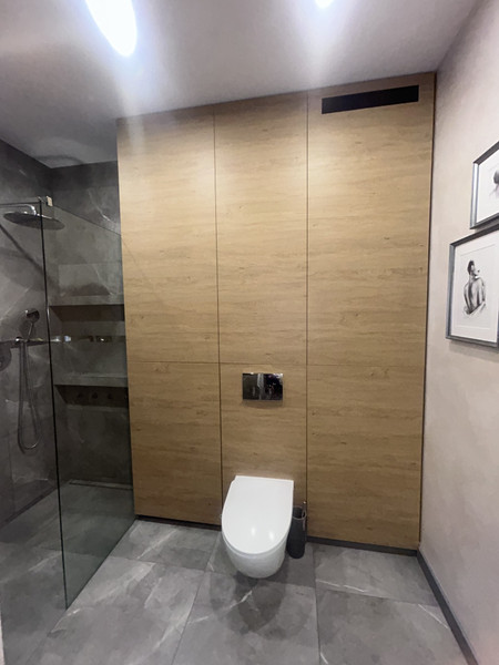 • łazienka z dużą zabudową (schowki, półki i ukryte miejsce na pralkę), wygodną kabiną typu walk-in