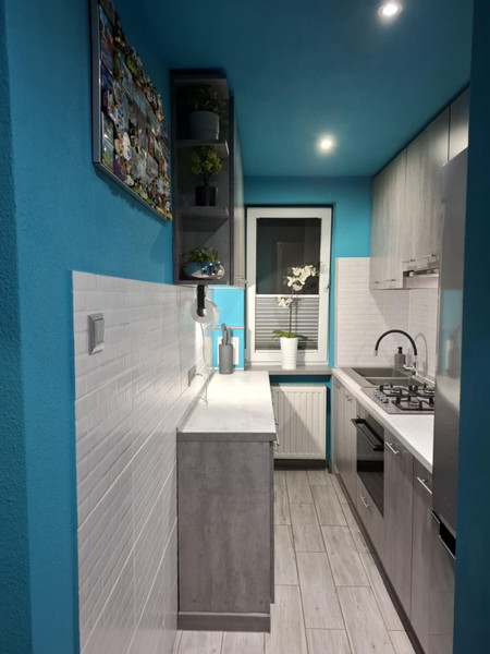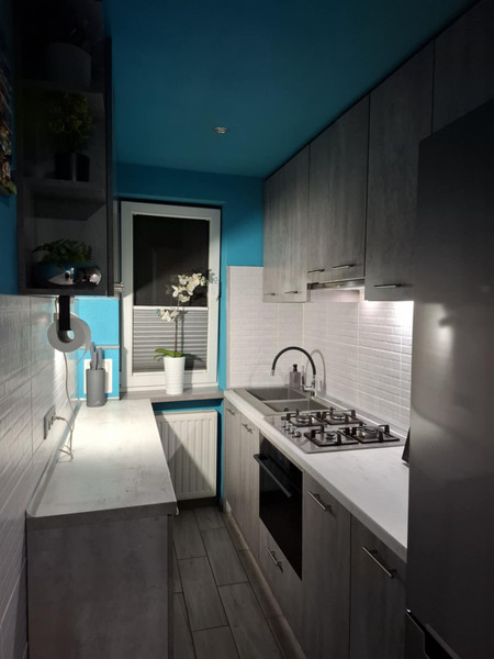 Mieszkanie przeszło generalny remont w 2017 roku. Mieszkanie było remontowane od "zera", były skute wszystkie tynki, podłogi itp. Były robione od nowa wszystkie instalacje, wylewki, tynki, sufity podwieszane, wymieniane grzejniki, okna i drzwi. Przedpokój, duży pokój, kuchnia - na ścianach i sufitach tynk ozdobny strukturalny Alpina. W małym pokoju na ścianach tapety, na suficie tynk strukturalny a na podłodze panele, przy suficie ozdobne oświetlenie ledowe. W łazience podłoga i ściany w kafelkach, sufit tynk strukturalny. Przedpokój i kuchnia podłogi w kafelkach. W dużym pokoju na podłodze panele.