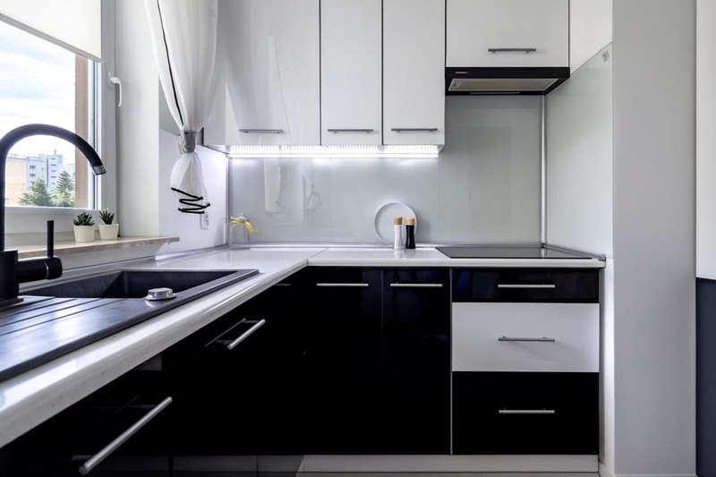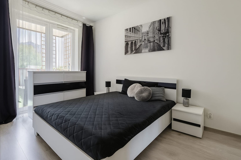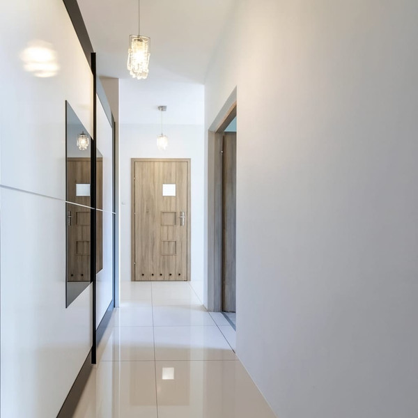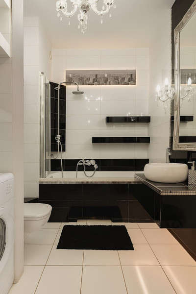 Wykończone w stylu glamour – dominują eleganckie biało-czarne dodatki, przeszklenia i połyskujące wykończenia. Duży, zadaszony balkon z zestawem wypoczynkowym.