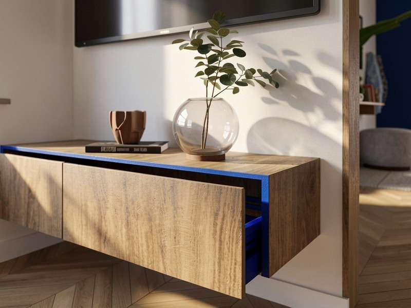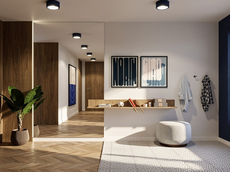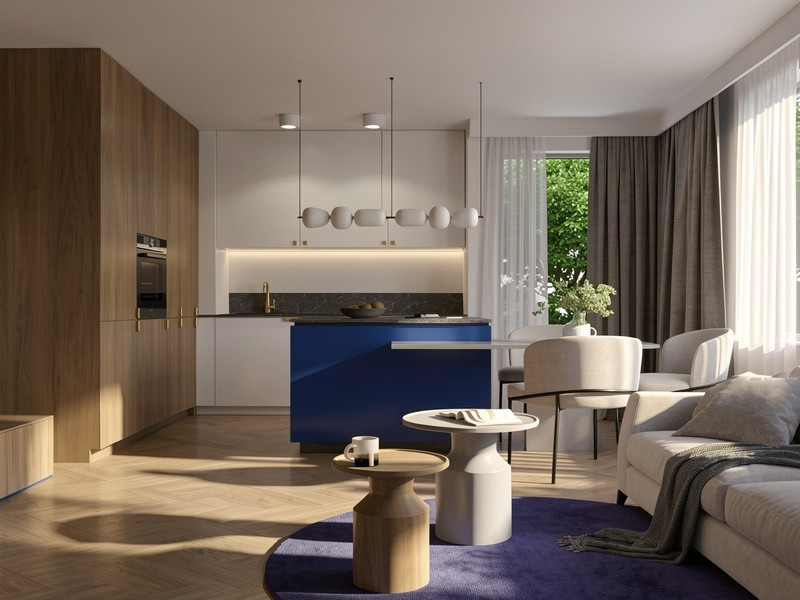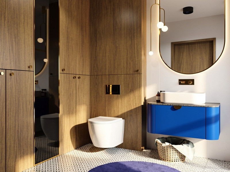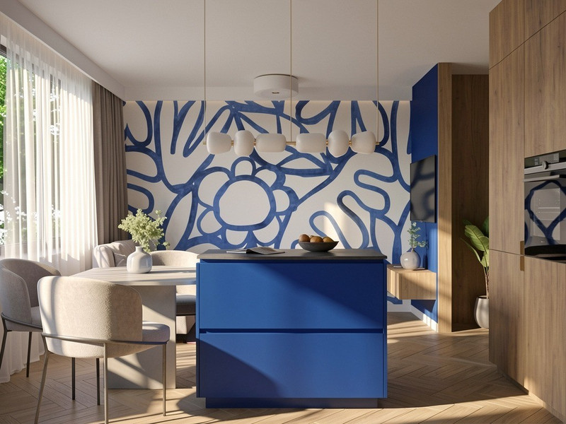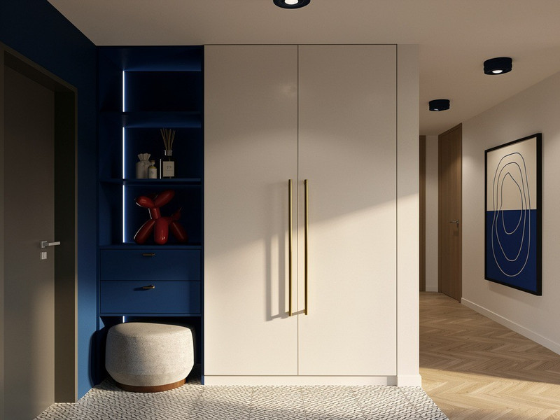 Wnętrze wyróżnia się odważną, elegancką kolorystyką. Niebieski w połączeniu ze złotymi akcentami, czernią, bielą i szarościami tworzy spójną, wyrafinowaną kompozycję. Całość ociepla naturalne drewno, które nadaje mieszkaniu przytulności i harmonii.