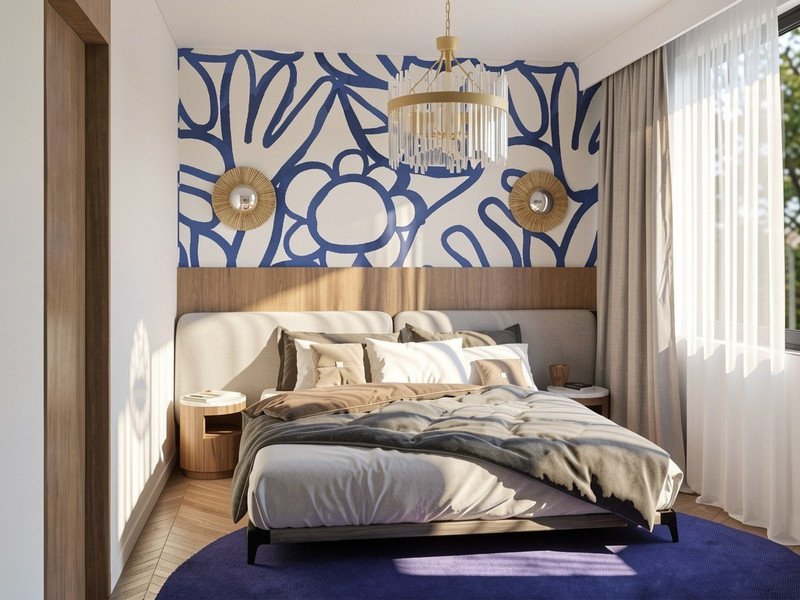 Wygodne łóżko z eleganckim zagłówkiem, nastrojowe oświetlenie, półka z podświetleniem LED oraz kinkiety do czytania tworzą atmosferę komfortu i relaksu.