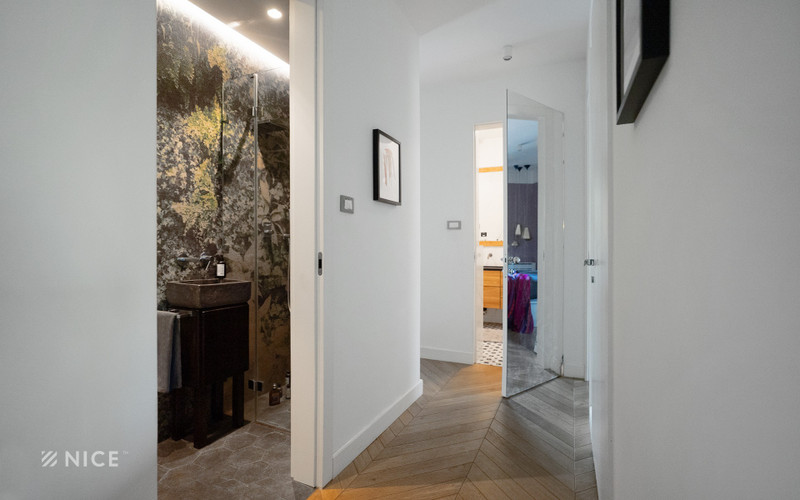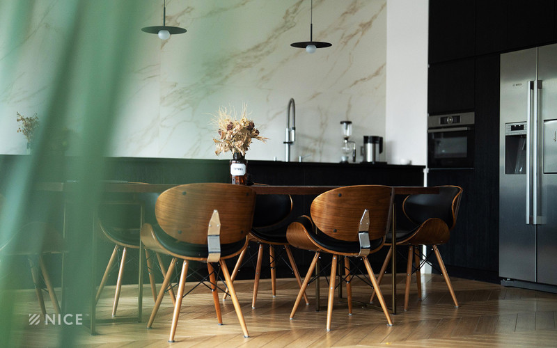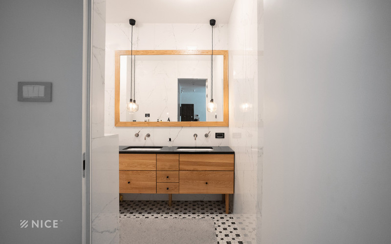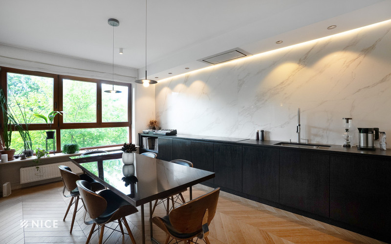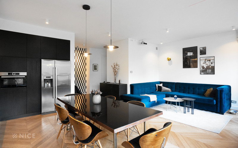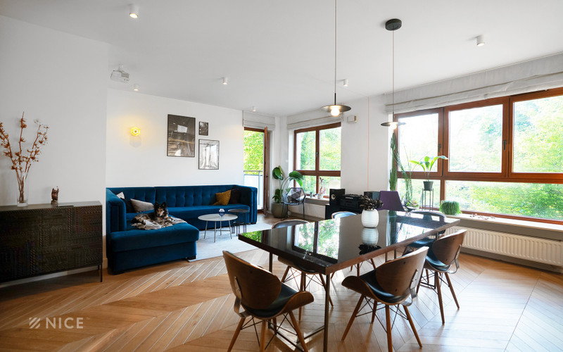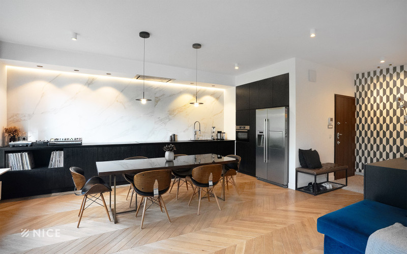 Apartament został zrealizowany w standardzie premium przez renomowaną pracownię architektoniczną. Część mebli to projekty autorskie, wykonane na zamówienie. Dębowy parkiet, kamienne blaty, drewniane szafki, dyskretne oświetlenie punktowe oraz drzwi o ponadstandardowej wysokości 2,84 m z zamkami magnetycznymi tworzą wyjątkową atmosferę luksusu.
