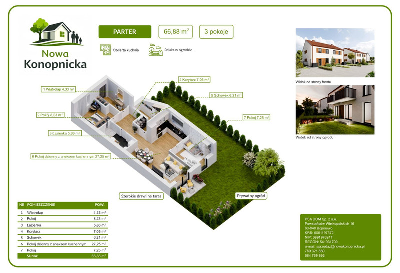 Oferujemy mieszkanie o powierzchni 66,88 m² zlokalizowane na parterze z własnym ogródkiem. Ogrzewanie podłogowe oraz ciepłą wodę zapewnia pompa ciepła. Lokal zostanie oddany do użytku w standardzie deweloperskim.