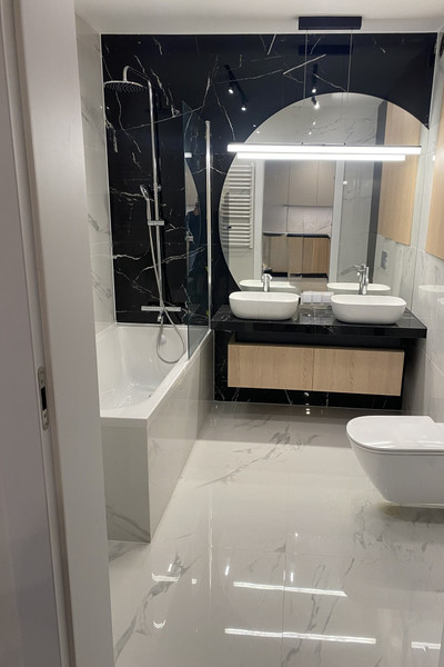 Łazienka z meblami wykonanymi na wymiar, wyposażona w: