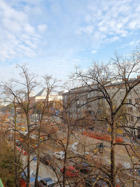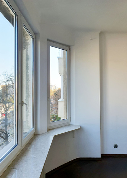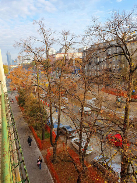 Z balkonu widok na Aleję Niepodległości, budynek SGH, widać też Pałac Kultury i Nauki, Marriott.