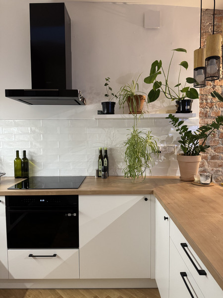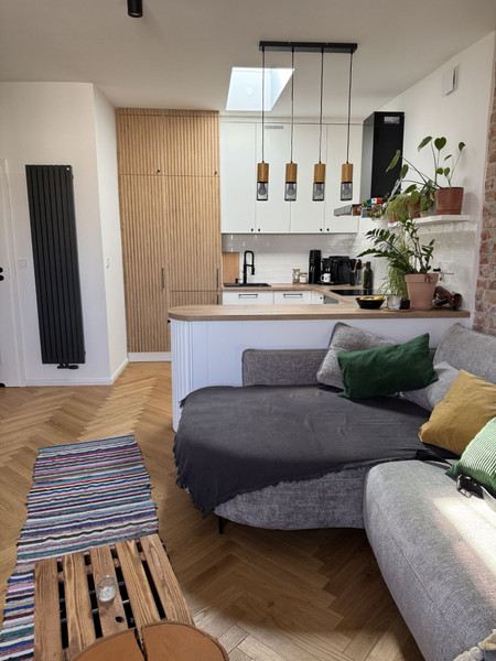 Mieszkanie przeszło generalny remont 2 lata temu. Było wykańczane „dla siebie” z użyciem wysokiej jakości materiałów, nie nosi widocznych śladów użytkowania. Dzięki wyburzeniu części ścian i zmianie układu funkcjonalnego, wnętrze zyskało na przestronności i metrażu.