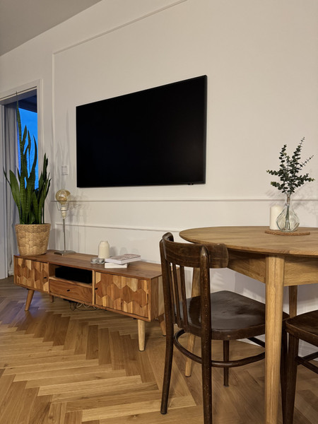 • w pokojach położono dębową deskę w jodełkę klasyczną, natomiast w łazience zainstalowano ogrzewanie podłogowe oraz bidetkę