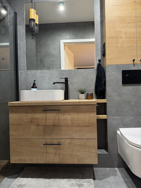 • zabudowa w łazience (szafka pod umywalkę oraz nad stelażem podtynkowym)