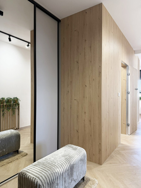 Podłogi: W całym mieszkaniu zastosowano podłogi „Lamele” o wysokiej klasie wytrzymałości, co nie tylko nadaje pomieszczeniom elegancki charakter, ale także gwarantuje długotrwałą estetykę i łatwość utrzymania w czystości. Atutem tej podłogi jest piękny wzór w tak zwana jodełkę oraz kolor Jasny Dąb.