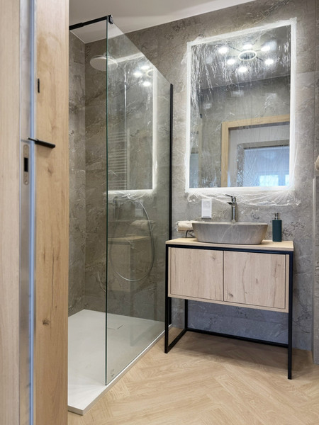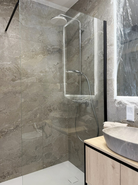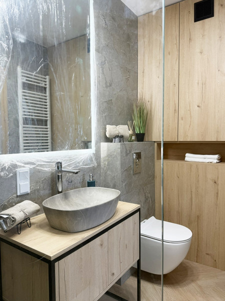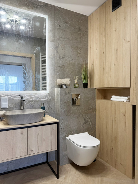 Łazienka: W łazience zastosowano gres (Auric light grey mat) o podwyższonej odporności na ścieranie oraz wilgoć. Wykorzystane armatury i sanitariaty pochodzą od renomowanych producentów, co gwarantuje nie tylko estetyczny wygląd, ale również niezawodność i trwałość.