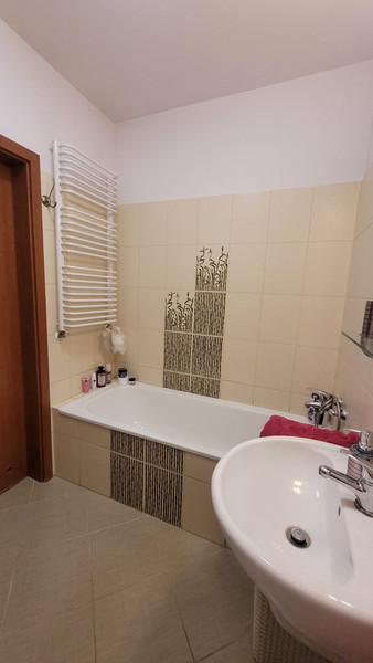 • Łazienka ( 3,95 m2) wyposażona w wannę, zabudowa wykonana przez stolarza pod kolor płytek na ścianach