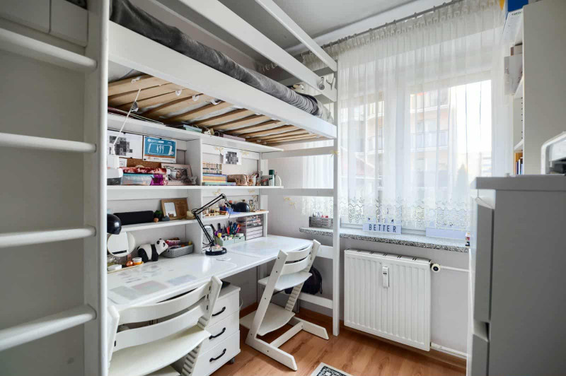 • dwie sypialnie (sypialnia główna oraz dziecięca z łóżkami na antresoli), z możliwością aranżacji na gabinet