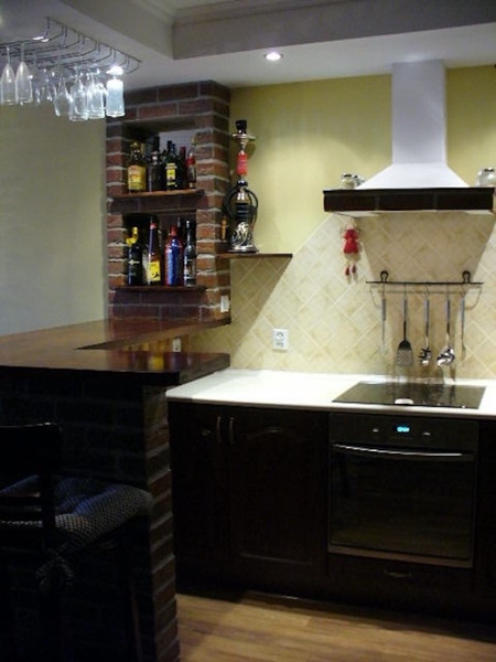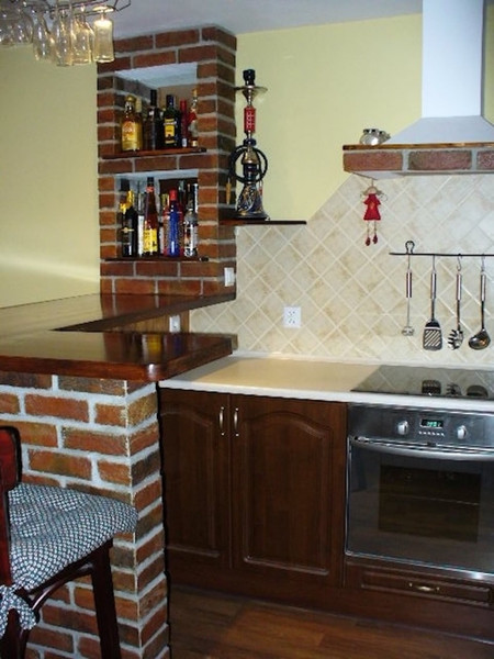 otwarta kuchnia z zabudową meblową i sprzętem AGD (lodówka, kuchenka elektryczna z piekarnikiem).