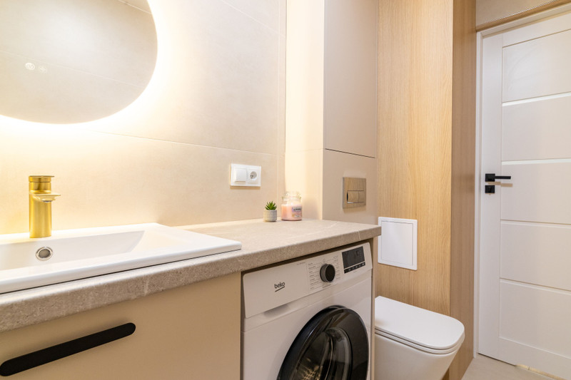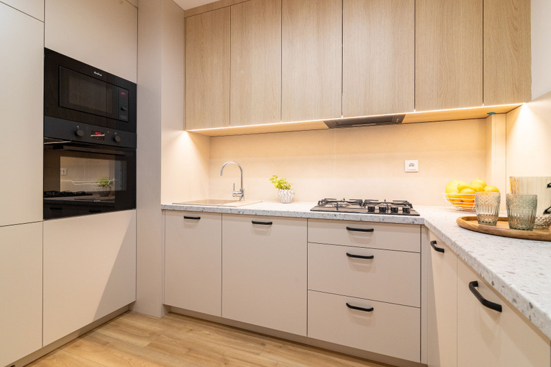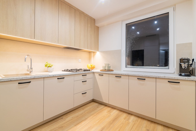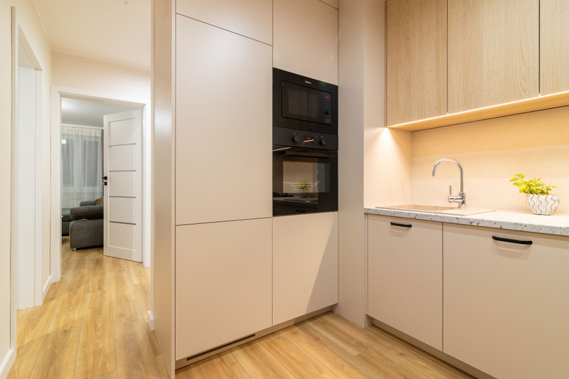 Kuchnia wykonana na wymiar przez stolarza — z pełnym zestawem AGD. Zabudowa w łazience również wykonana na zamówienie.