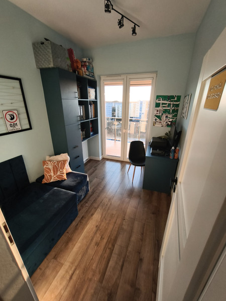 Całkowita powierzchnia nieruchomości wynosi 56,51 m2. W skład mieszkania wchodzi ustawny salon z aneksem kuchennym (21,20 m2), pokój (13,84 m2), pokój (8,01 m2), łazienka z WC (6,17 m2), korytarz (7,29 m2) oraz bardzo duży balkon (11,95 m2). Czynsz wynosi 658 zł.