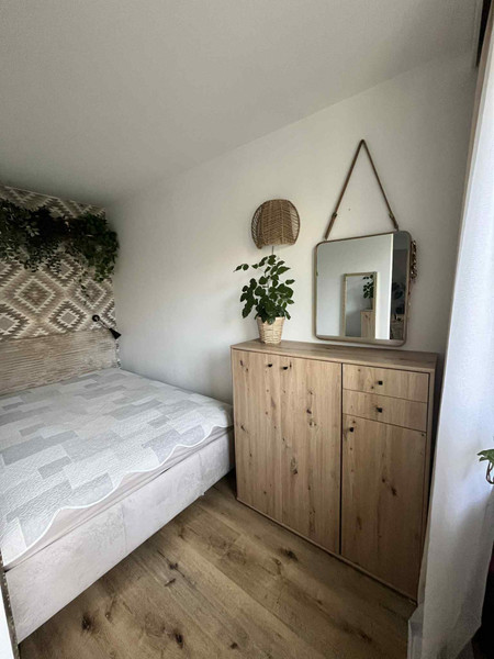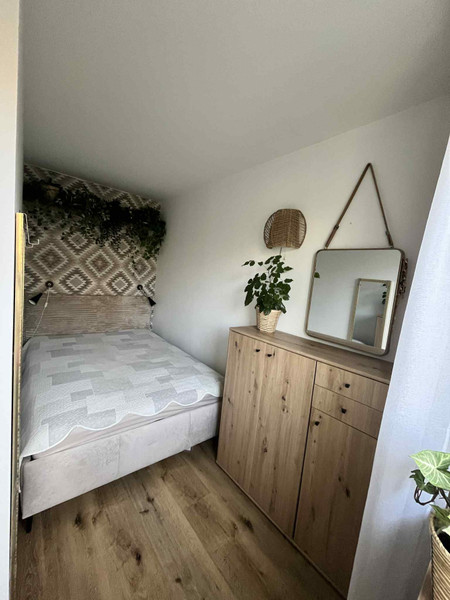 w większym pokoju ścianka działowa wydzielająca komfortową strefę sypialnianą