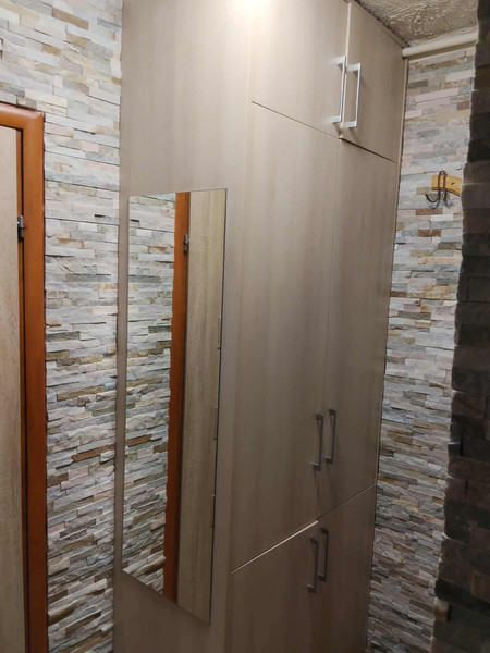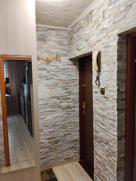 • Przedpokój z dużą szafą w zabudowie i dekoracyjnym kamieniem na ścianach.