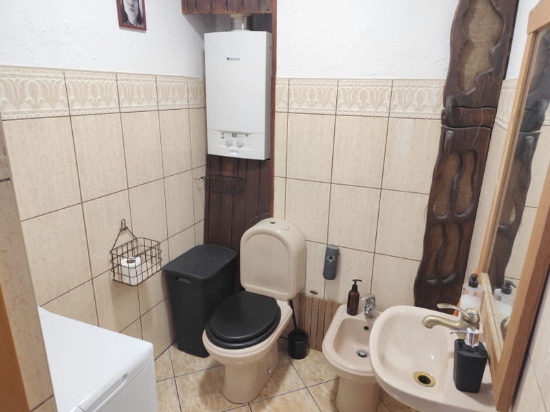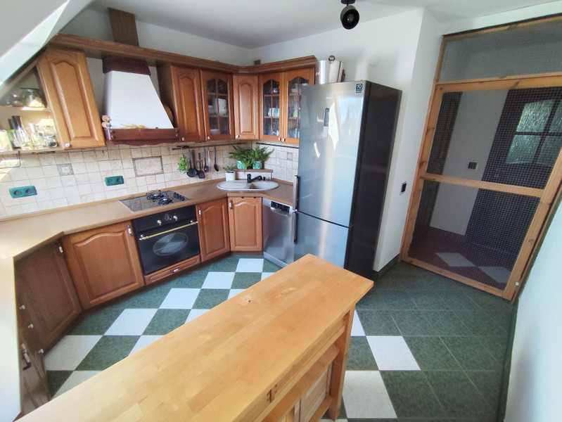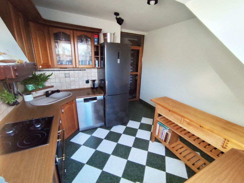 Kuchnia na wymiar (zostaje) – fronty z litego dębu, sprzęt: kuchenka gazowo-elektryczna (indukcja), lodówka, zmywarka, pralka. W przedpokoju duża szafa w zabudowie z lustrem (zostaje). Łazienka z dużą wanną i kabiną prysznicową + osobne WC z bidetem.