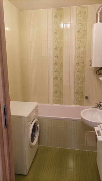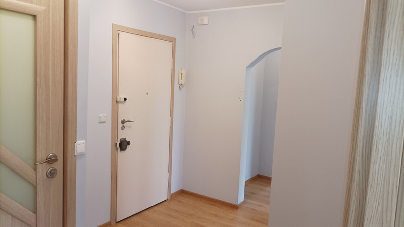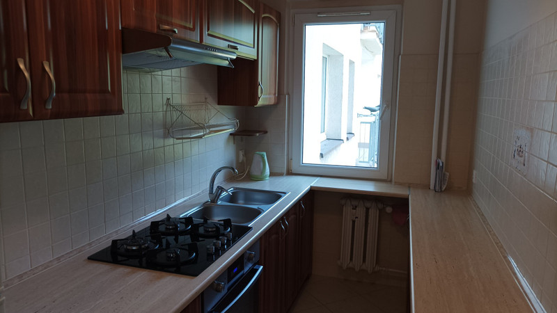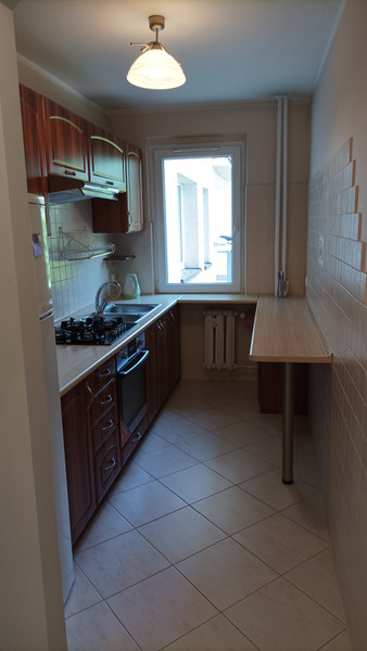 Kuchnia wyposażona w nowe meble na wymiar wraz z płytą gazową oraz piekarnikiem. Lodówka używana. Przestronny salon z dużą szafą przesuwną we wnęce. W łazience wanna, umywalka, lustro, szafeczki oraz używana pralka.