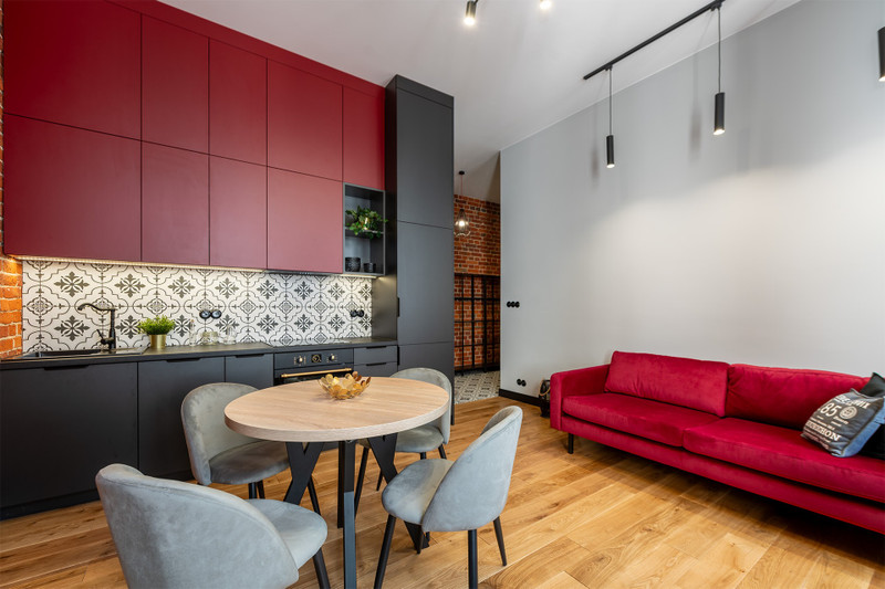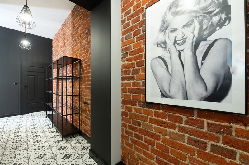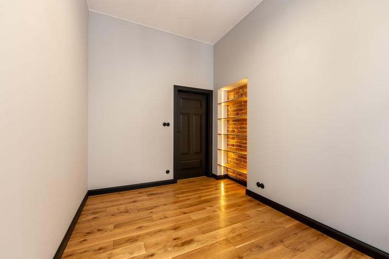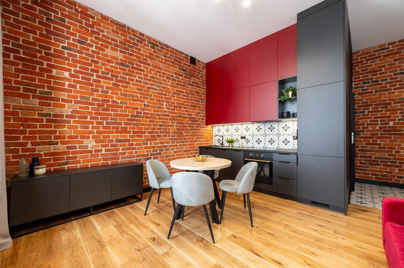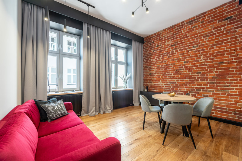 W mieszkaniu położono nową podłogę z desek z litego drewna dębowego oraz przeprowadzono renowację cegły na ścianie w salonie i całym przedpokoju, odsłaniając jej niepowtarzalne piękno. Wszystko po to, by zachować kamieniczny, wyjątkowy charakter mieszkania.