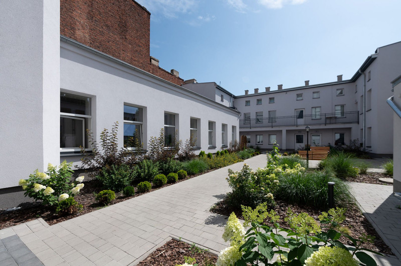 Wewnątrz posesji znajduje się zadbany, wyłożony kostką brukową i oświetlony dziedziniec wraz z nasadzeniami.